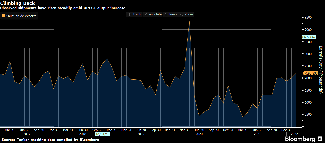 Le esportazioni di petrolio saudite sono tornate ai livelli pre-pandemia. C'è ancora spazio per aumentare le esportazioni di circa 0,5 milioni di barili al giorno, a dimostrazione del fatto che la capacità dell'Arabia Saudita di prevenire l'aumento dei prezzi è limitata. Fonte: Bloomberg