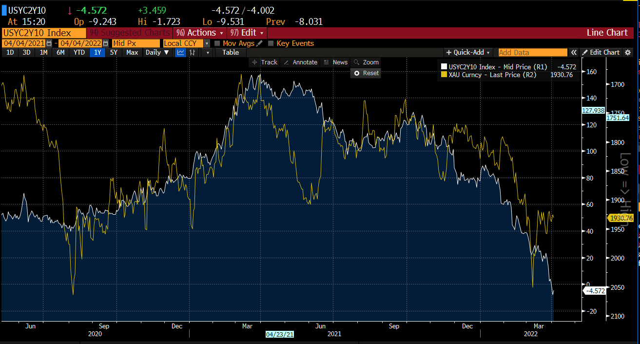 - Curva dei rendimenti USA invertita (i rendimenti a 2a sono superiori di oltre 4 punti base rispetto ai rendimenti a 10a). Una forte correlazione inversa può essere individuata con l'oro. Se la curva dei rendimenti dovesse continuare a invertirsi, l'oro potrebbe trarne vantaggio. Tuttavia, le inversioni della curva dei rendimenti tendono ad essere eventi di breve durata
