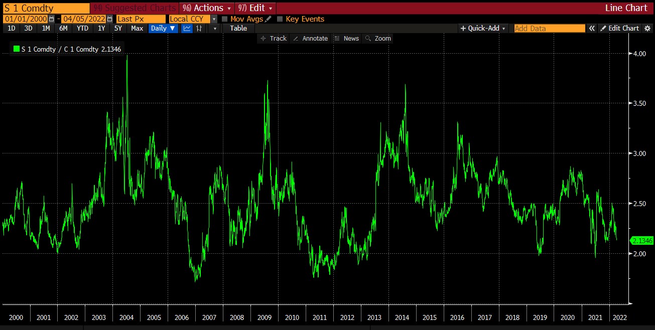 Il rapporto tra il prezzo della soia e il prezzo del mais è sceso in modo significativo, ma rimane al di sopra di 2,00, un livello che storicamente ha visto inversioni. Fonte: Bloomberg