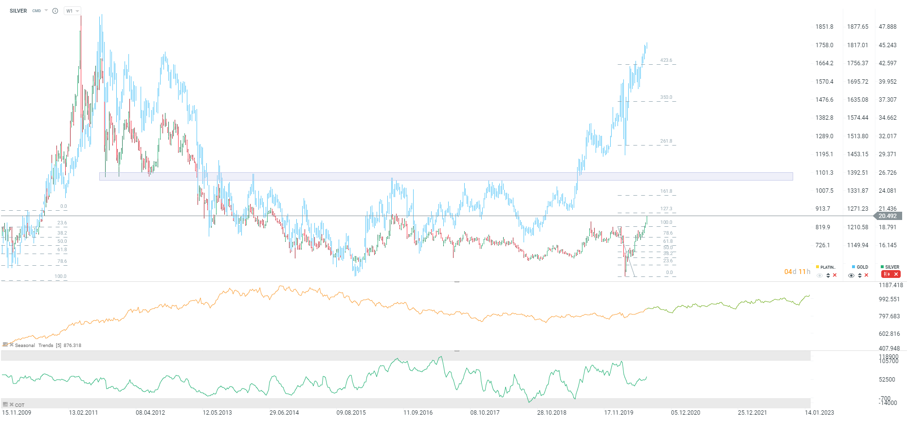 L'argento è scambiato a circa $ 20,50 l'oncia, il livello più alto dal 2016. Tuttavia, questo mercato sembra ancora sottovalutato rispetto all'oro. Fonte: xStation5