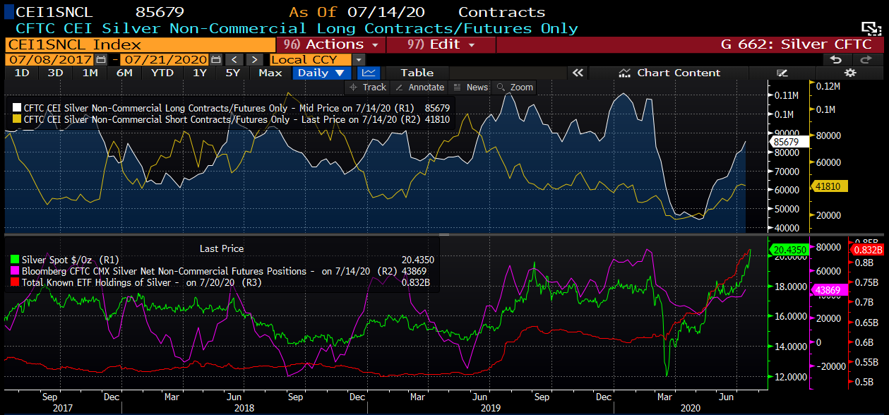 L'aumento simultaneo del numero di posizioni aperte Long e Short aperte significa che l'argento non è ancora iper comprato. È stato possibile rilevare forti acquisti di ETF nelle ultime settimane. Fonte: Bloomberg