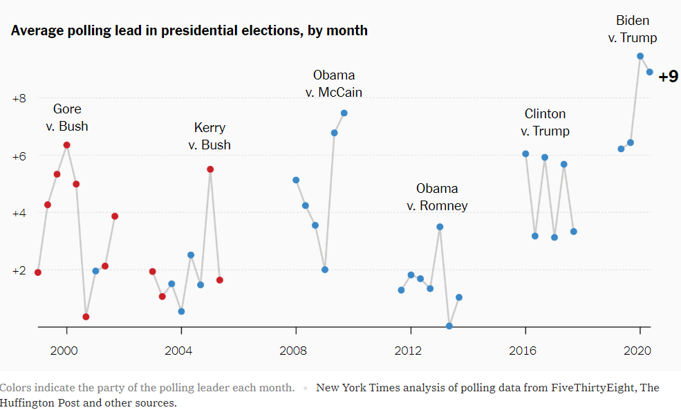 Joe Biden ha un grande margine su Trump nei recenti sondaggi. Fonte: The New York Times