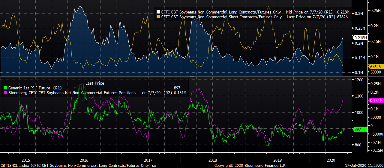 La soia sembra essere fortemente iper comprata. Tuttavia, il posizionamento speculativo è fuori dai massimi a 5 anni. Fonte: Bloomberg