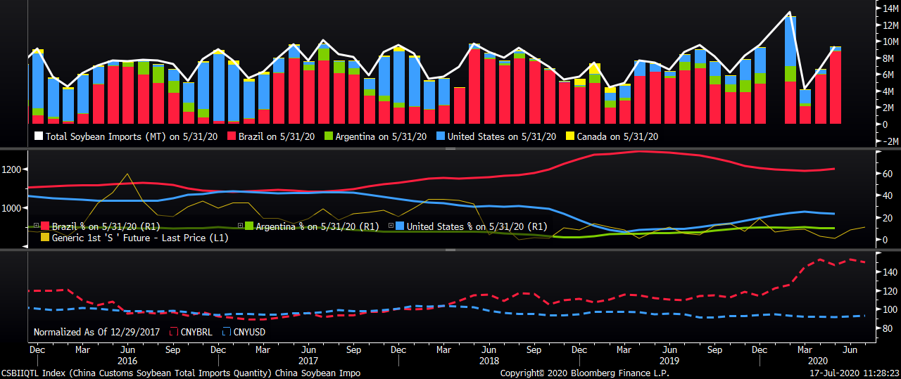 Il Brasile continua ad essere il principale fornitore di soia per la Cina. Fonte: Bloomberg