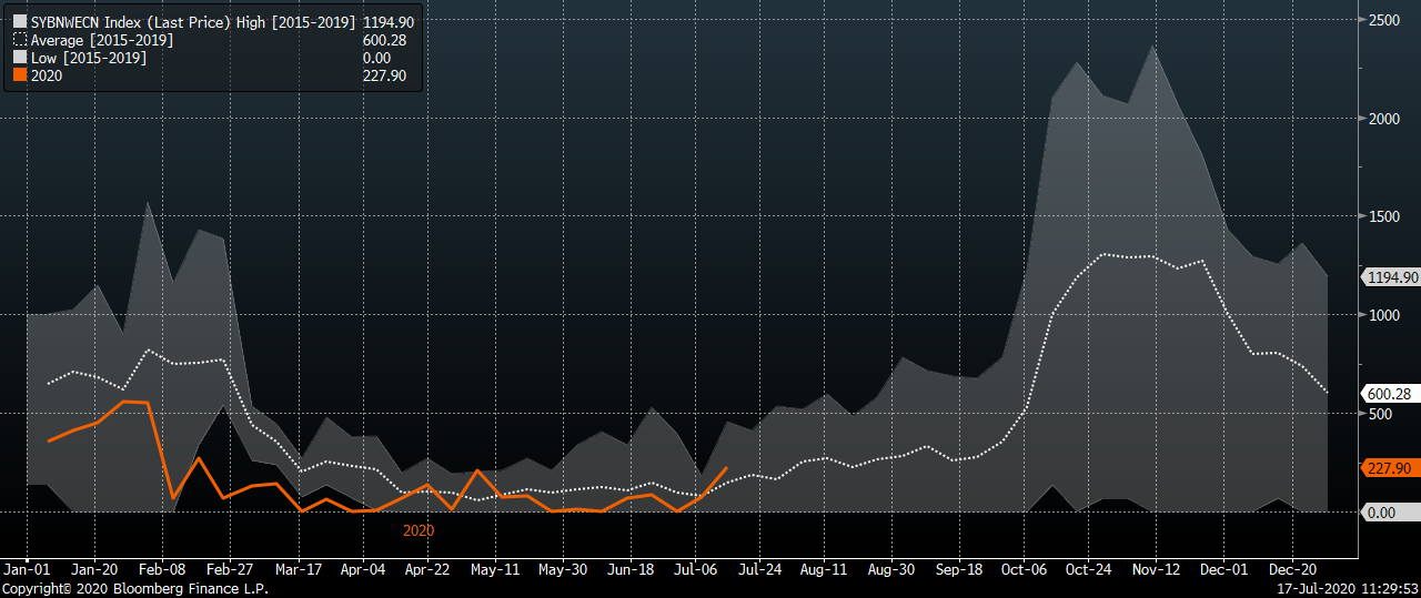 - Il posizionamento speculativo continua a indicare che la soia è iper comprata. Il numero di posizioni Short è a un livello estremamente basso. I modelli stagionali suggeriscono un calo del prezzo almeno fino alla fine di agosto