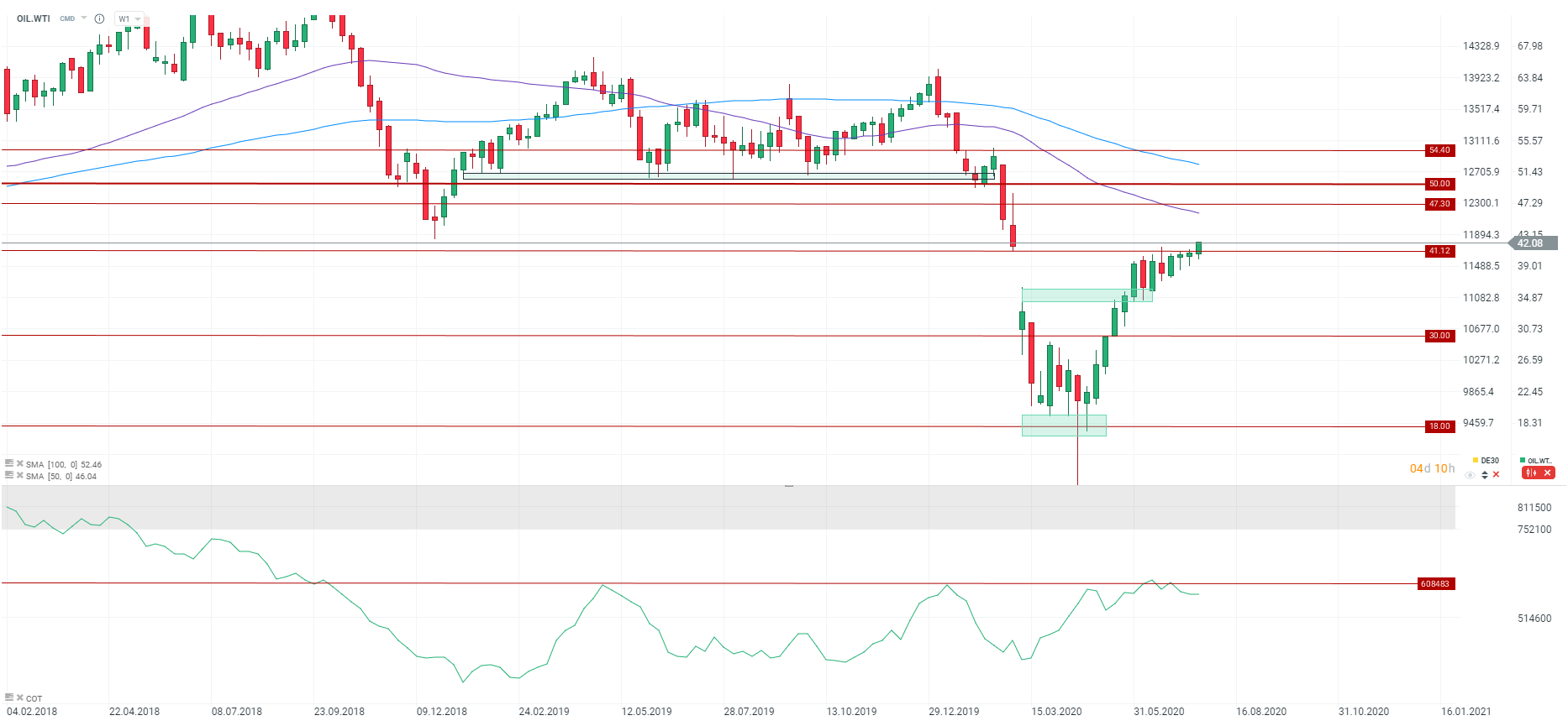 Il WTI supera la resistenza a $ 41. Il posizionamento speculativo è relativamente alto ma non ha raggiunto un livello di ipercomprato. Fonte: xStation5