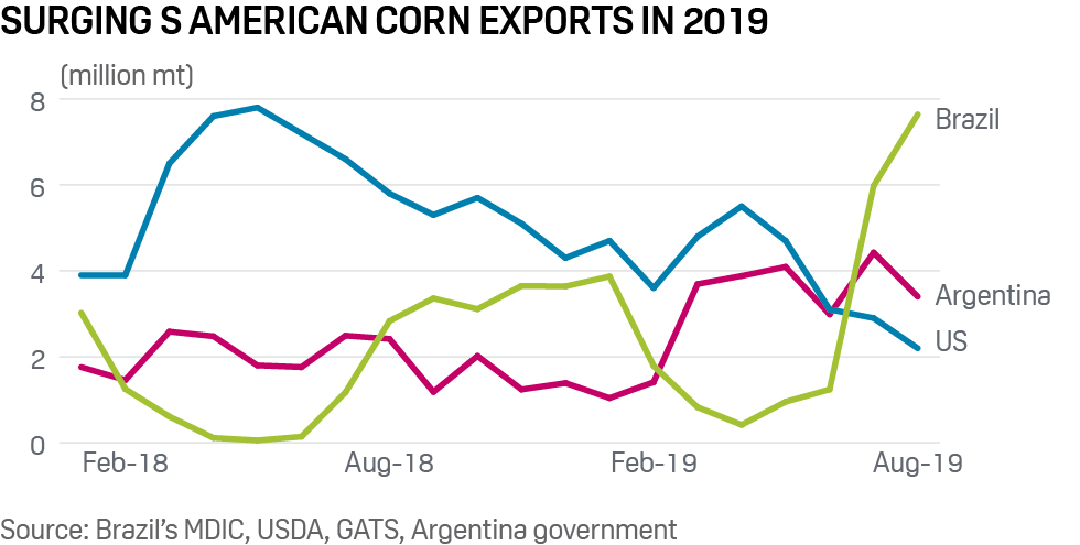 Il Brasile può essere considerato una minaccia per le esportazioni di mais degli Stati Uniti. Tuttavia, nel caso in cui le relazioni cinesi-americane migliorino, la prospettiva delle esportazioni statunitensi potrebbe migliorare e la domanda di mais americano potrebbe aumentare. Fonte: Bloomberg