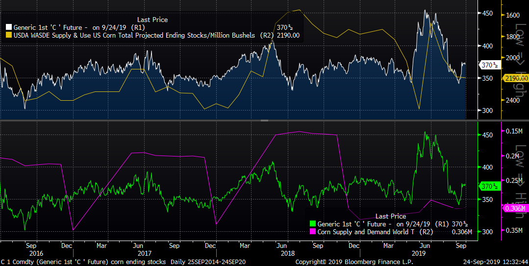 È possibile individuare una correlazione a lungo termine tra scorte di mais e prezzo. Una scarsa qualità delle colture può far diminuire le stime dello stock finale nelle stagioni successive. Fonte: Bloomberg
