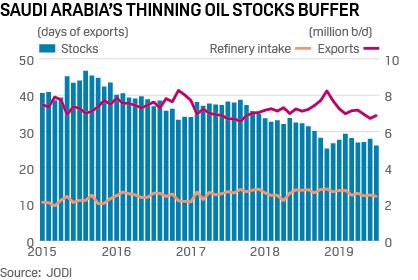 L'Arabia Saudita ha grandi scorte di petrolio, che durerebbero per circa 30 giorni nel caso in cui la produzione fosse completamente interrotta. La capacità inutilizzata delle raffinerie saudite era pari a circa 1,5 mbg prima degli attacchi. Fonte: S&P Global Platts, JODI