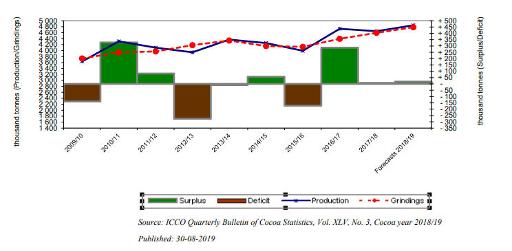 Un leggero eccesso di offerta durante le due stagioni precedenti suggerisce possibili problemi di offerta nel caso in cui la domanda continui a crescere rapidamente. Fonte: ICCO