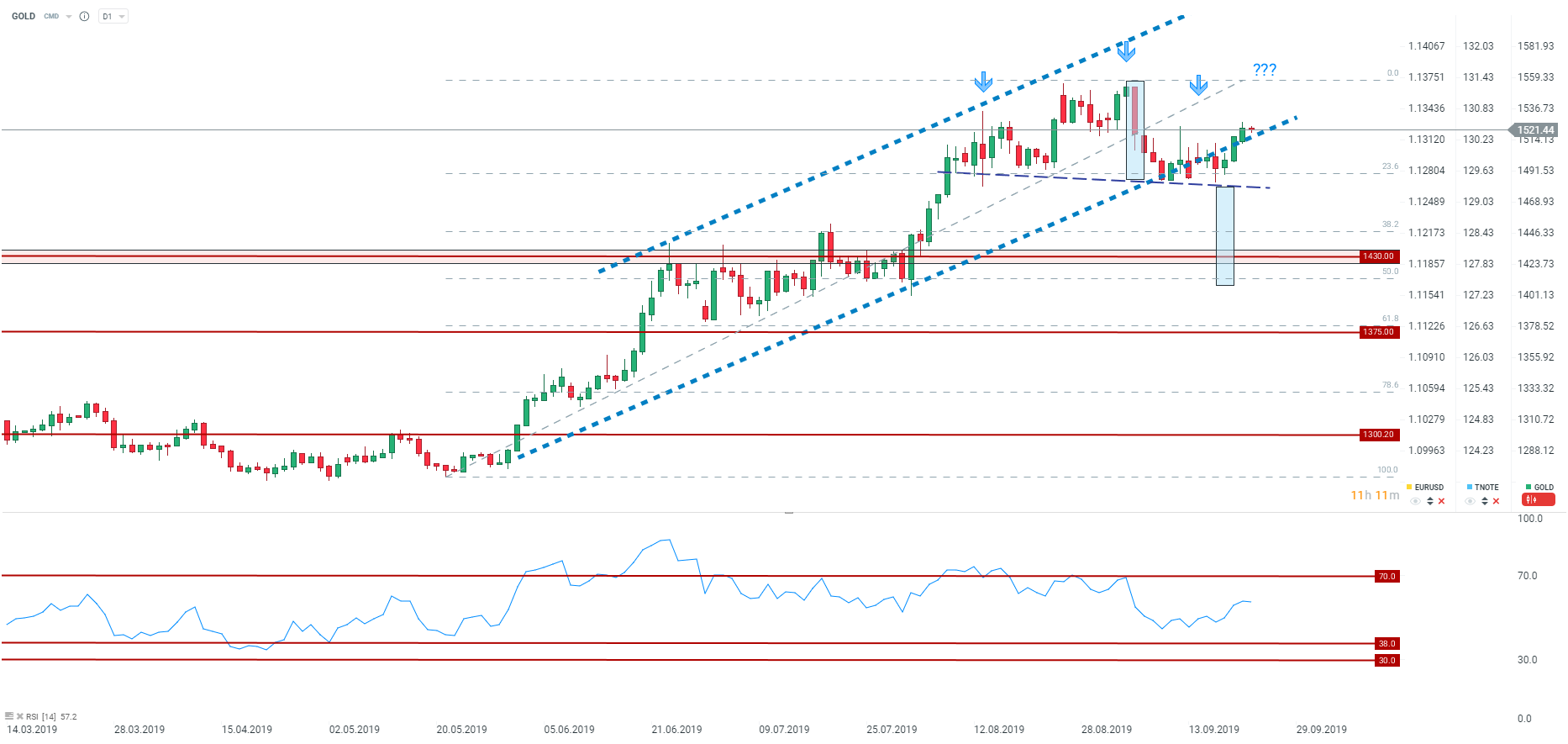 Il prezzo dell'oro minaccia di oltrepassare la spalla destra della formazione testa e delle spalle e di invalidare il modello. Fonte: xStation5