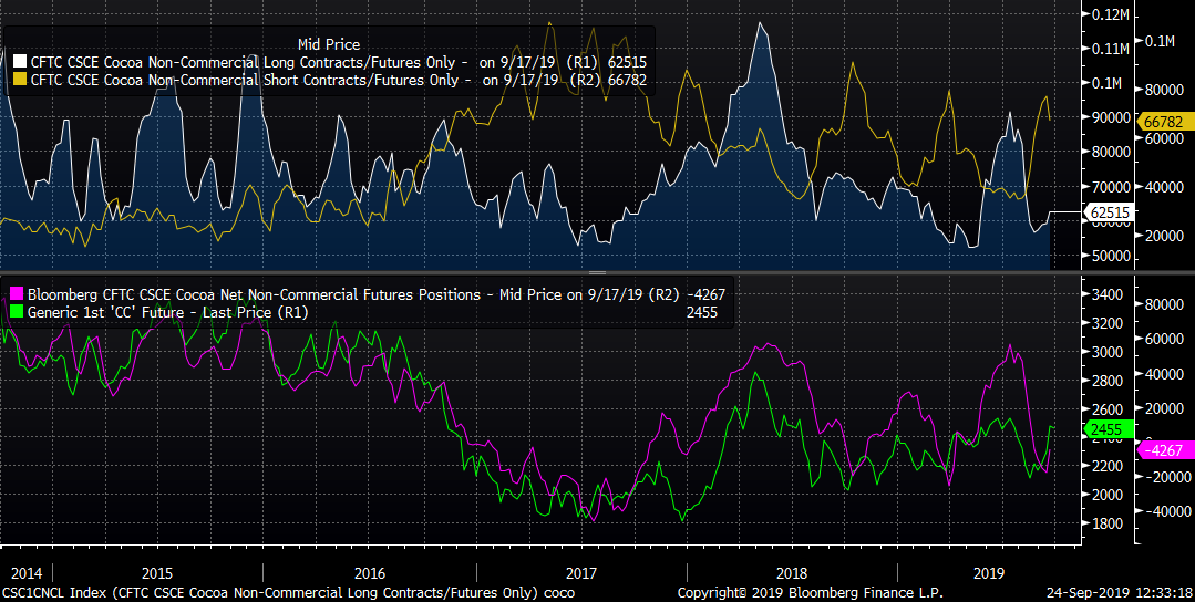 Il posizionamento speculativo sul cacao ha raggiunto il punto di flesso suggerendo che il rally potrebbe durare più a lungo. Fonte: Bloomberg