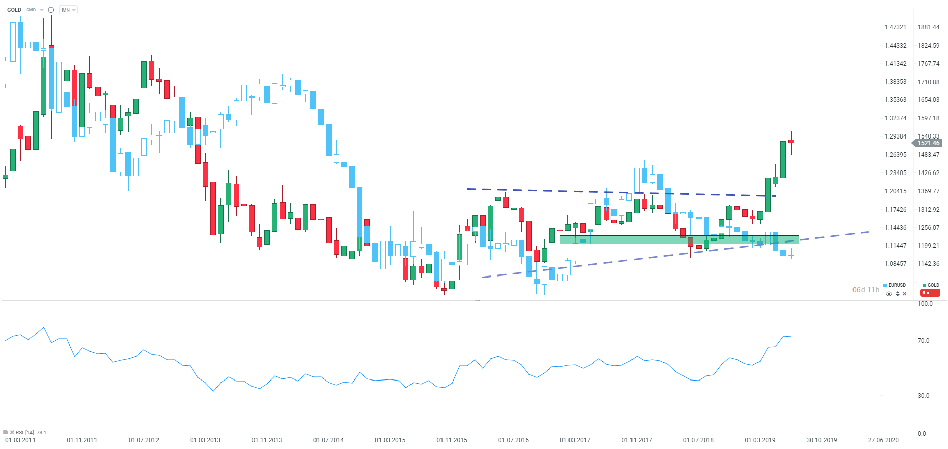 Una massiccia divergenza tra oro ed EURUSD può essere individuata nell'intervallo mensile. La forma dell'attuale candeliere mensile sarà cruciale in quanto un doji potrebbe mettere a rischio la continuazione di una mossa verso l'alto. Fonte: xStation5