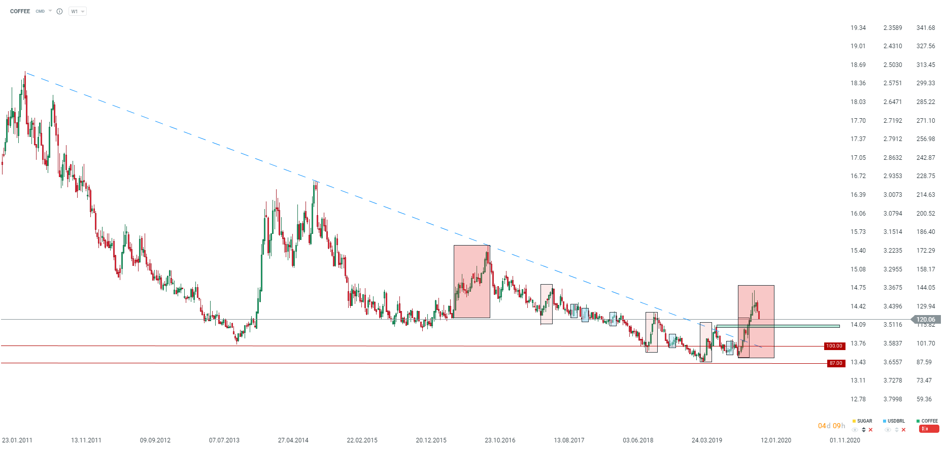 Il caffè avrebbe potuto già spostarsi in un range simile a quello del 2016. D'altra parte, non si può escludere che si tratti solo di una correzione. Fonte: xStation5