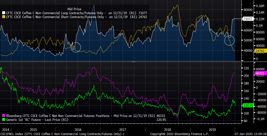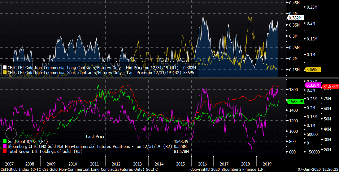 Aumento significativo del numero di posizioni Long all'inizio del 2020. Il posizionamento è quasi agli estremi del 2016. Fonte: Bloomberg