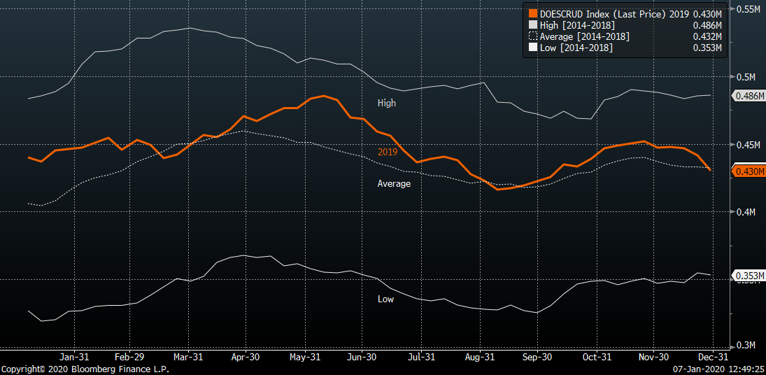 - Le scorte di petrolio greggio sono diminuite in modo significativo nell'ultima settimana del 2019. Secondo gli schemi stagionali, gli inventari petroliferi dovrebbero iniziare a salire ora