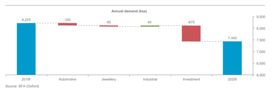 La domanda di platino dovrebbe diminuire nel 2020, principalmente a causa del calo degli investimenti. Fonte: Platinum Investment