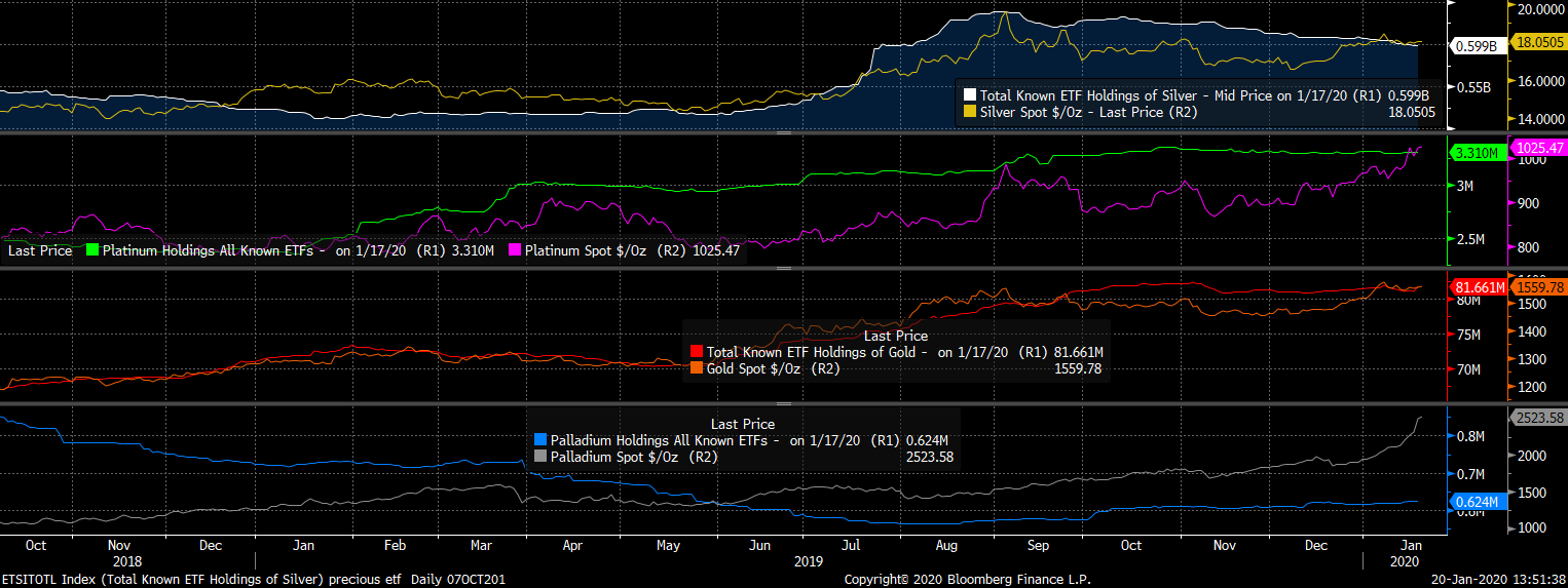 La domanda dagli ETF è stata forte nella prima metà del 2019 ma si è stabilizzata nella seconda metà. D'altra parte, la domanda speculativa è in aumento. Fonte: Bloomberg
