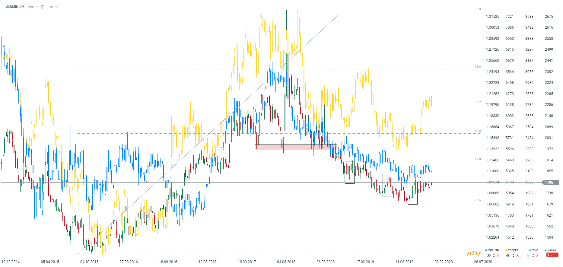 L'alluminio testa la resistenza chiave a $ 1800 / tonnellata. Il pullback sul mercato del rame può essere visto come un rischio per l'alluminio in quanto potrebbe indicare una performance simile per l'intero segmento dei metalli di base. D'altro canto, l'alluminio sembra essere fortemente correlato con l'EUR / USD, pertanto la debolezza dell'USD potrebbe rappresentare una possibilità per i prezzi dell'alluminio. Fonte: xStation5