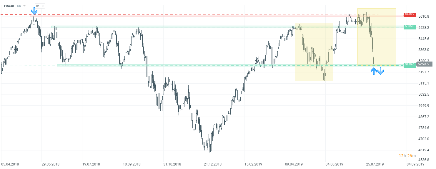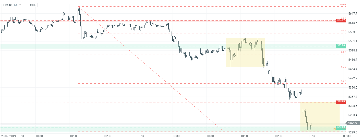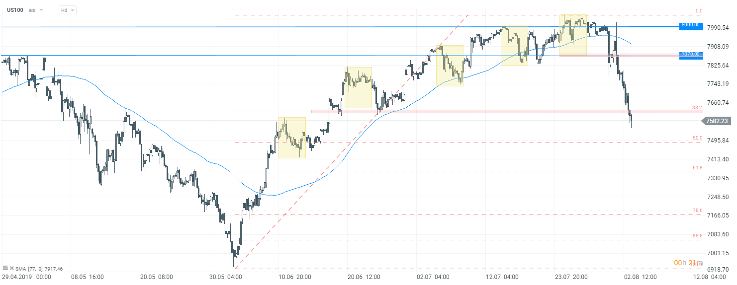 Oggi, durante la sessione asiatica, si potevano osservare cali significativi sui mercati azionari. Il sentimento nel Vecchio Continente è debole così come gli umori pessimisti che dopo le ore di trading asiatiche si sono diffusi in Europa. Tutto ciò è dovuto all'intensificazione del conflitto tra Stati Uniti e Cina. Secondo i rapporti dei media, la Cina sta mettendo in dubbio il senso di ulteriori negoziati con gli Stati Uniti dopo che Donald Trump ha imposto nuove tariffe la scorsa settimana. L'analisi odierna si concentrerà sulla situazione degli indici FRA40 e US100. Per quanto riguarda l'indice europeo, all'inizio della sessione odierna è stato individuato un divario di prezzo al ribasso. I ribassi hanno accelerato dopo l'apertura del mercato e come risultato si è vista una mossa al di sotto dell'handle di 5535 punti. A sua volta, il prezzo ha raggiunto il supporto chiave, contrassegnato dalla struttura di overbalance e dai minimi precedenti locali. Da un punto di vista tecnico, sembra un buon punto di partenza per la correzione, ma si dovrebbe tenere presente che la tendenza generale è al ribasso e le diminuzioni potrebbero approfondirsi.