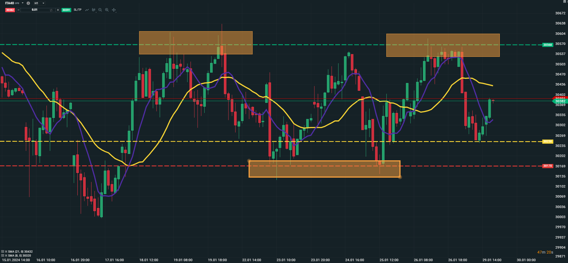 L'indice italiano è riuscito a rimbalzare dalla zona dei 30,250 punti dopo un calo di oltre l'1% dal limite superiore del recente trading range intorno a 30,560. Mentre gli investitori attendono gli eventi chiave di questa settimana, resta da vedere se ITA40 riuscirà ad estendere la ripresa o se riprenderà il movimento al ribasso. Fonte. xStation