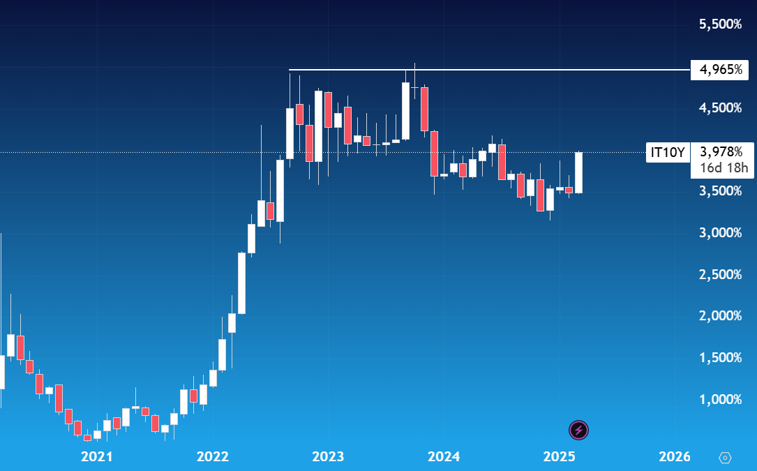Rendimento dei Btp a 10 anni, ancora lontani i massimi di rendimento del 2023 - Fonte: TradingView.com