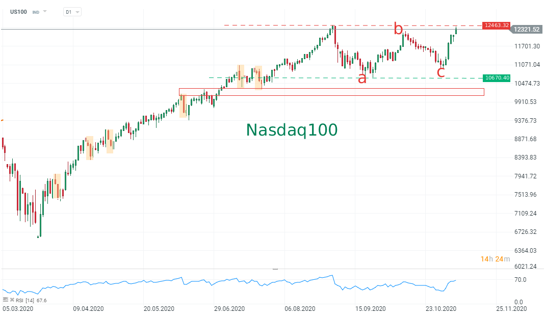 Le azioni hanno registrato una gigantesca inversione di tendenza la scorsa settimana e lunedì gli umori euforici hanno dominato di nuovo. Anche se la vittoria di Biden negli Stati Uniti era inizialmente vista come dannosa per i titoli tecnologici, US100 è stato il più grande vincitore poiché gli investitori sperano che il Senato repubblicano blocchi qualsiasi iniziativa fiscale (più alta). Più di ogni altra cosa, questo rally riflette ancora una volta il dilemma degli investitori: quali alternative alle azioni ci sono nel mondo dei tassi dello 0%?