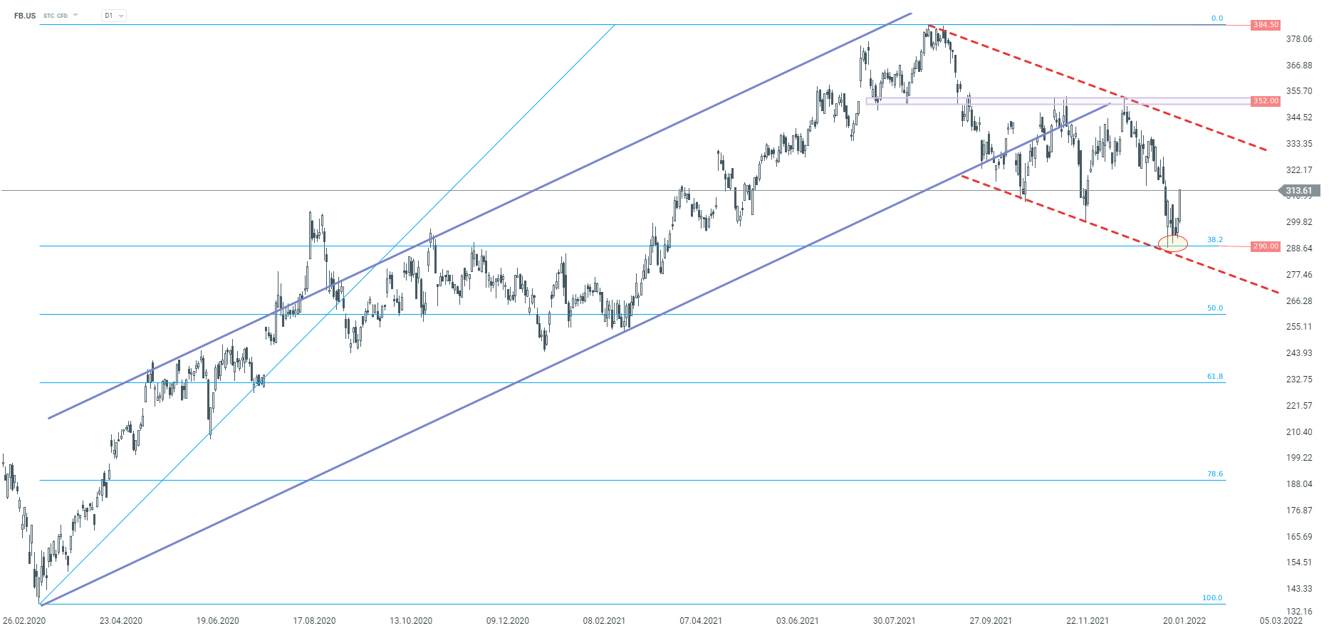 Il titolo Meta Platforms (FB.US) è sceso sotto il limite inferiore del canale al rialzo e ha iniziato a muoversi in un canale al ribasso. Le azioni sono recentemente rimbalzate dal limite inferiore del canale vicino al 38,2% del ritracciamento della mossa di ripresa post-pandemia. La resistenza più vicina da tenere d'occhio si trova al limite superiore del canale ribassista in area 340$.