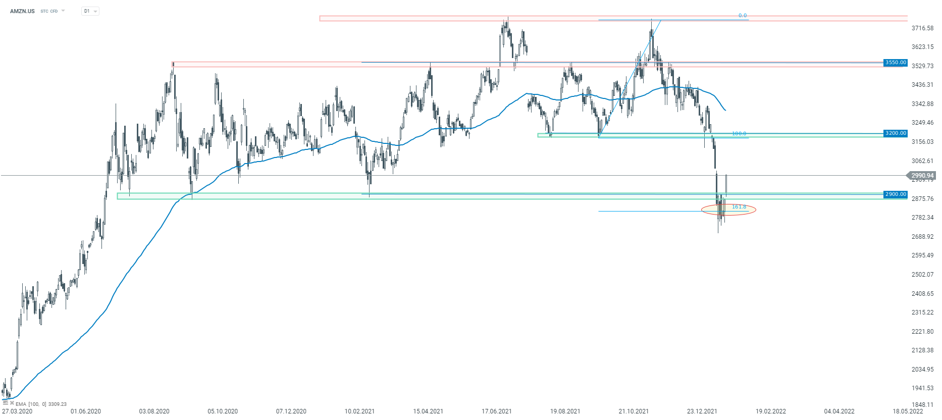 Amazon (AMZN.US) ha avuto un inizio anno pessimo. Il prezzo delle azioni è precipitato e ha raggiunto il livello più basso dalla metà del 2020. Tuttavia, il prezzo ha reagito al 161,8% del ritracciamento esterno di quell'impulso al rialzo del quarto trimestre 2021 e questa settimana è iniziata una mossa di ripresa. Il titolo torna sopra la zona di supporto di $ 2.900 e potrebbe raggiungere la prossima grande resistenza nell'area di $ 3.200 se il rapporto sugli utili supera le aspettative.