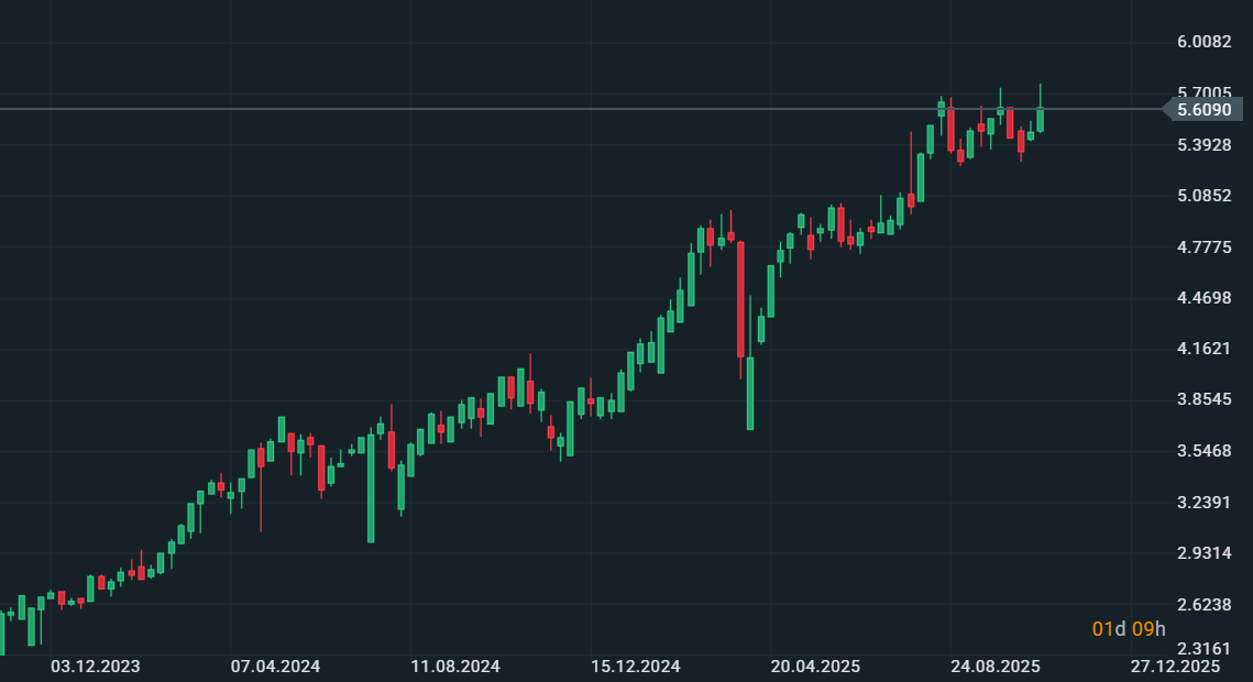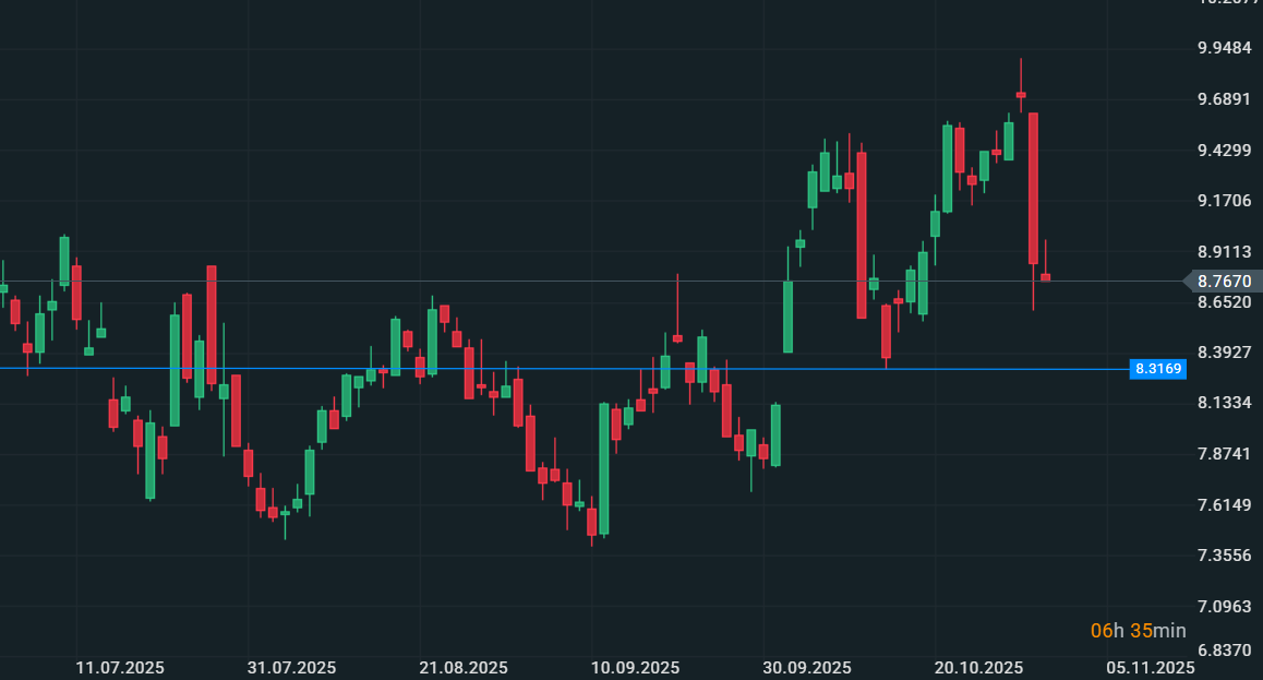 Trimestrale poco entusiasmante di Intesa che di fatto chiude i primi 9 mesi del 2025 in crescita del 6% con un utile a 7,6 miliardi di euro. I dati risultano peggiorati su base trimestrale con la gestione operativa in calo del -9,3% da 4,33 a 3,93 miliardi di euro, cosi come il risultato netto che passa da 2,6 a 2,37 miliardi di euro. Fortunatamente Intesa rimane un player importante del credito in Italia con i suoi 43 miliardi di euro erogati tra famiglie e imprese, mentre l'impatto dei crediti deteriorati é all'1,1%. Il titolo peró perde oltre il -2,5% nelle contrattazioni di oggi, un ribasso dovuto probabilmente alla delusione dei dati su base trimestrale. La dinamica di lungo termine rimane comunque rialzista.