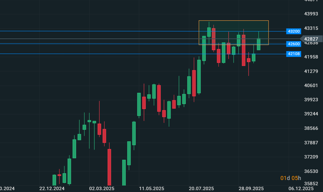 A ridosso della chiusura mensile delle quotazioni, il Ftse Mib rimane al di sotto dei massimi di Agosto pur mantenendo una dinamica dei prezzi rialzista. Cosí come per gli altri indici europei, il Ftse Mib risulta debole rispetto ad America e Giappone ma allo stesso non mostra segnali evidenti di debolezza. Per il momento il mercato sta testando i massimi delle scorse settimane seppur non vada a formare pattern ribassisti di rilievo. L'area da monitorare é quella tra i 42100 e i 43200.