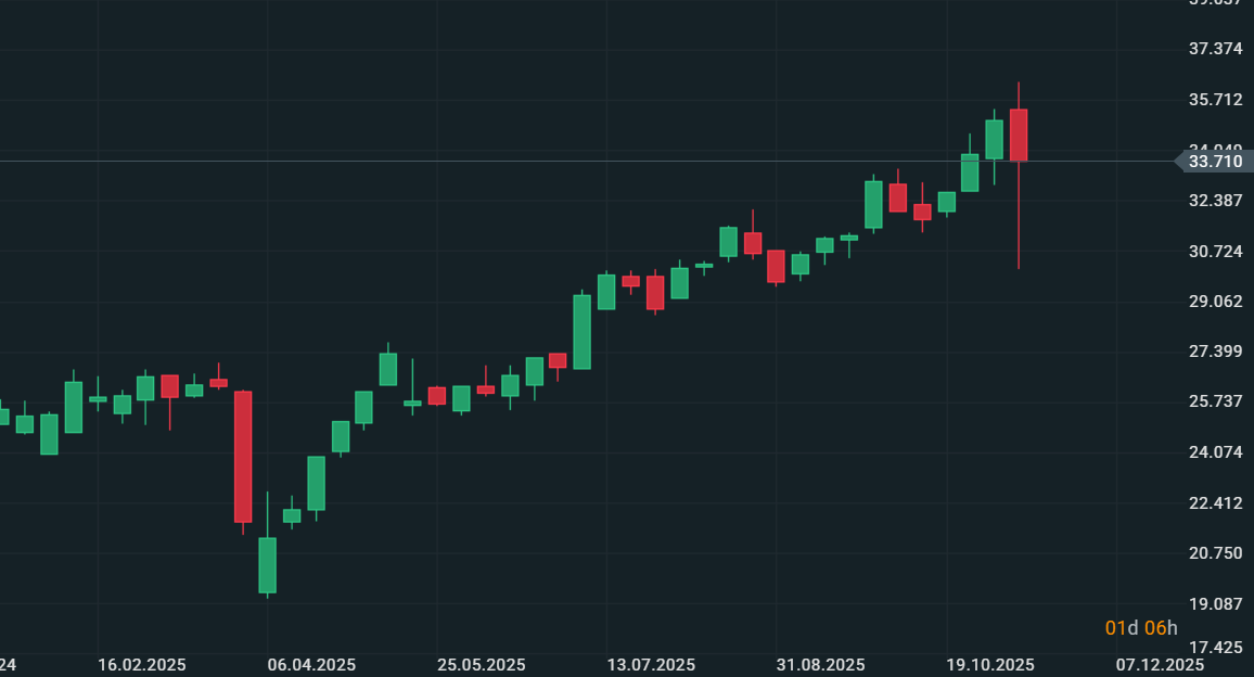 Il Ftse Mib ha registrato questa settimana i nuovi massimi storici a ridosso dei 44700 punti andando a rompere con forza i massimi visti nel corso delle scorse settimane. Importante sottolineare come il ribasso degli ultimi due giorni di negoziazione sia impattante a livello grafico in quanto vediamo una shadow ribassista molto pronunciata e che potrebbe fare da barriera per eventuali movimenti rialzisti di breve nel corso della prossima settimana. La situazione tecnica rimane peró rialzista con la chiusura positiva su base settimanale, ma il test dei massimi attuali nel corso della prossima settimana potrebbe avviare un altro movimento ribassista, previe condizioni di inversione intraday evidenti.