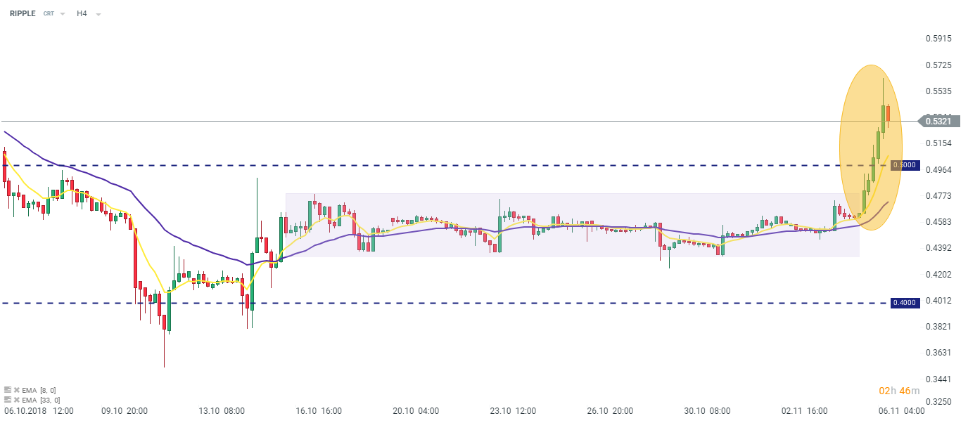 RIPPLE undoubtedly attracts a lot of crypto traders’ attention today as it has surged around 15.5% over the past 24 hours. The virtual currency began rally yesterday after three weeks of calmness, and today it continues to march higher (an orange area on the chart). Moreover, the digital currency jumped over ETHEREUM, and it has became the second largest cryptocurrency by the market capitalization for a moment. Note that RIPPLE is the only one major cryptocurrency with such a stellar performance today. Source: xStation5