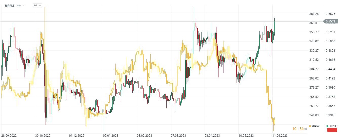 Nelle ultime settimane, che sono state molto deboli per le crypto, il prezzo di Ripple è riuscito a salire inaspettatamente. Il grafico sottostante mostra la divergenza tra Binancecoin (grafico giallo) che testa i minimi di dicembre e Ripple, che sta guadagnando da fine maggio. A differenza di Bitcoin e della maggior parte delle criptovalute. Il mercato sta valutando positivamente le possibilità di vittoria in tribunale, con il giudice che ha consentito la prova delle corrispondenze interne della Commissione nel caso nonostante la protesta della SEC.