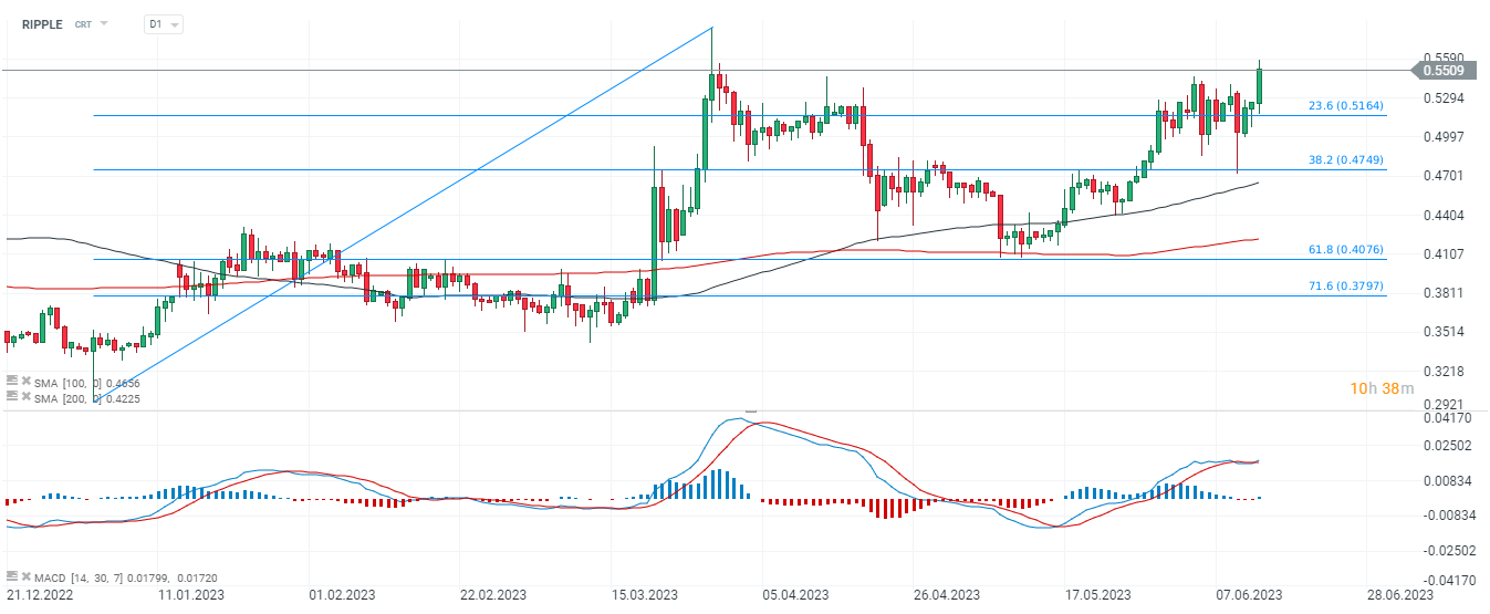 RIPPLE sta salendo in prossimità di 0,56 USD e potenzialmente il superamento della resistenza psicologica ai massimi precedenti a 0,57 USD potrebbe aprire la strada a 0,68 USD, dove il prezzo potrebbe incontrare la prima resistenza significativa (azione del prezzo passata). Fonte: xStation5