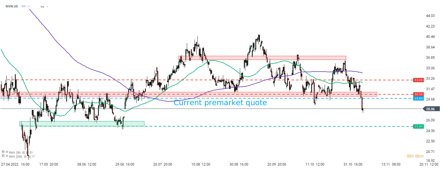 Le azioni di Rivian sono in rialzo di oltre il 6% nel premercato e l'attuale quotazione del premercato suggerisce un'apertura della sessione a $ 29,84, leggermente al di sotto della zona di resistenza che si aggira intorno ai $ 30,50. Le azioni sono scese al di sotto di questa zona e si sono spostate al livello più basso dall'inizio di luglio ieri durante un ampio sell-off di Wall Street, ma sembra che oggi possa essere fatto un tentativo di risalire al di sopra di questa zona. Ovviamente, va notato che l'IPC statunitense alle 13:30 GMT potrebbe avere un grande impatto sul mercato se dovessimo vedere una grande deviazione dalle aspettative del mercato e quindi l'impatto del rilascio degli utili di Rivian sul prezzo delle azioni potrebbe essere compensato da - fattori non specifici dell'azienda.