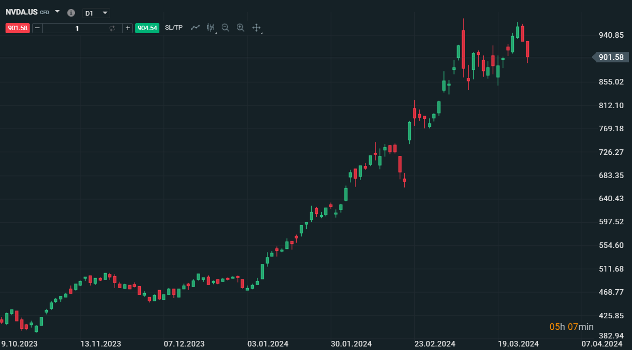 Attenzione a Nvidia che scarica i massimi dei 950 dollari ad azione da ieri sera e apre con un fortissimo movimento ribassista che caratterizza tutta la prima ora di negoziazione. Osservando il grafico giornaliero di Nvidia, sembra proprio che il colosso dell' IA voglia rallentare e sbollentare gli animi euforici di coloro che vedono nel titolo un'opportunitá anche a questi prezzi. A livello tecnico servirebbe la conferma su base settimanale e su base mensile per poi vedere, eventualmente, un test dei massimi in area 960 dollari ad azione nel corso del mese di aprile, mese che inizierá con uno dei dati piú attesi a livello macroeconomico, il tasso di disoccupazione USA. Al momento il titolo si indebolisce ma é ancora presto per parlare di ribasso consolidato. Per vedere un eventuale ribasso di Nvidia, servono conferme sui timeframe piú importanti, conferme che arriverebbero solamente dopo la pausa di Pasqua.