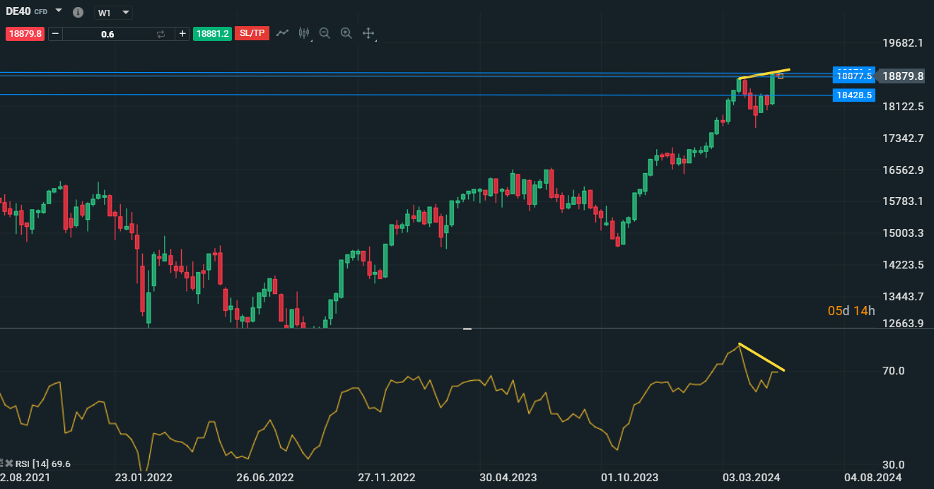 Dax in ipercomprato sull'RSI e la divergenza sui massimi - Fonte:XStation