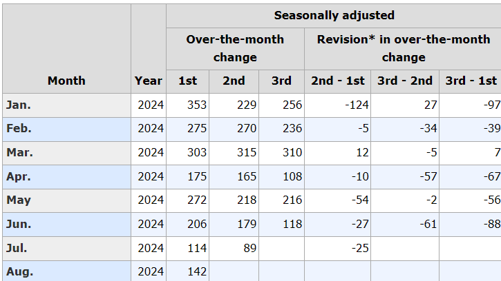 Sui NFP, dato utilizzato spesso da Powell nelle sue conferenza stampa come un sano indicatore di come l'economia Usa sia stata, almeno negli ultimi mesi, "strong & resilient" (forte e resiliente). Importantissime sono le revisioni del dato che vedono ben 15 revisioni in negativo su 18 mesi presi in esame a partire da gennaio 2023. Proprio venerdí é uscita la revisione definitiva del mese di giugno, una revisione che di fatto ha "tagliato" ben 88k posti di lavoro. Consideriamo il fatto che nel 2023 la somma delle revisioni si porta a 360k unitá con un ritmo mensile di 30k posti di lavoro tagliati dalle revisioni, peggio invece il 2024. Per quest'anno il ritmo delle revisioni é quasi raddoppiato in quanto da gennaio 2024 fino a giugno 2024 vediamo un totale di 340k posti tagliati dalle revisioni il che porta ad una revisione media mensile vicina ai 57k posti di lavoro tagliati. In sostanza, 15 revisioni su 18 a partire dal 2023 e ritmo di revisione quasi raddoppiato nel 2024, la situazione non é assolutamente in miglioramento.