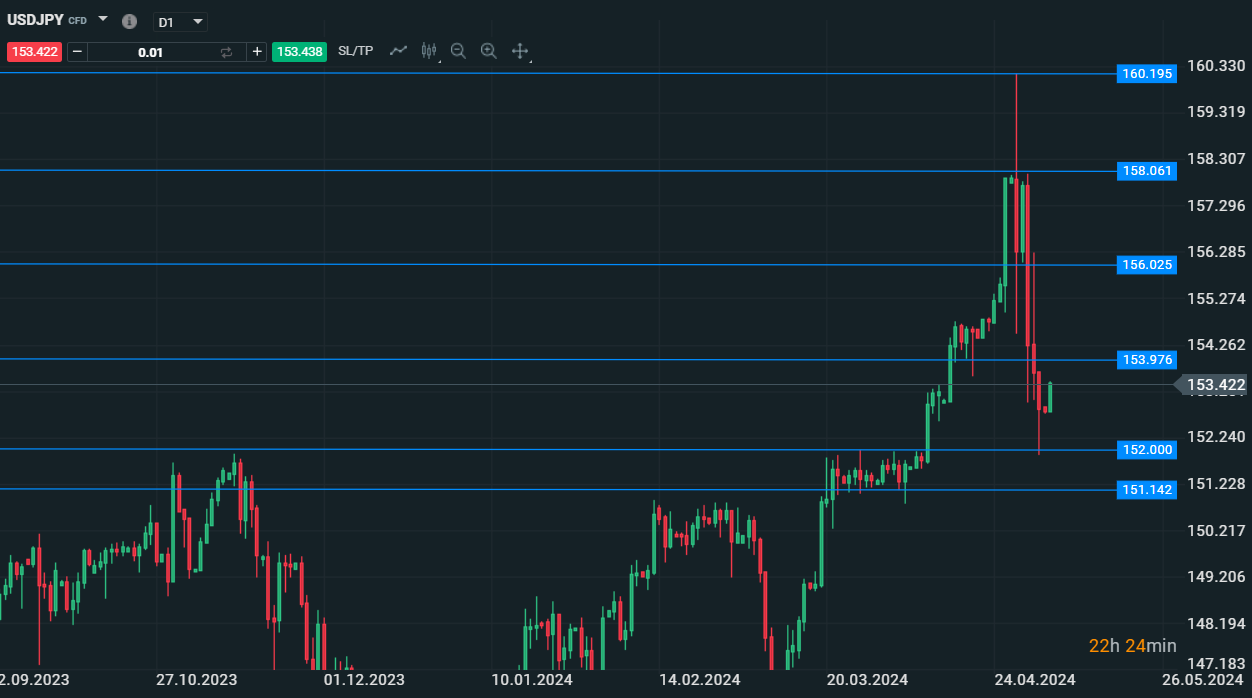Il cambio UsdJpy é stato oggetto di due possibili interventi in soli 3 giorni, un evento mai verificatosi sul Forex e che vede la Bank of Japan come messa in crisi direttamente dal mercato stesso, mercato che in questo momento sta probabilmente cambiando idea nel lungo periodo sul cambio UsdJpy. Sono 4 gli interventi in poco piú di un anno e mezzo, il primo intervento nel settembre 2022, il secondo a ottobre 2022, gli ultimi due nell'arco di 3 giorni, l'ultimo subito dopo la conferenza stampa di Jerome Powell. Il ribasso settimanale é stato pari a 8 figure, tanto basta per pensare ad un'inversione di lungo periodo. In questa settimana potremmo vedere ulteriori test di area 154 per poter vedere ulteriori allunghi ribassisti. La situazione su questo cambio si fa molto interessante per questa settimana e per quelle a venire.