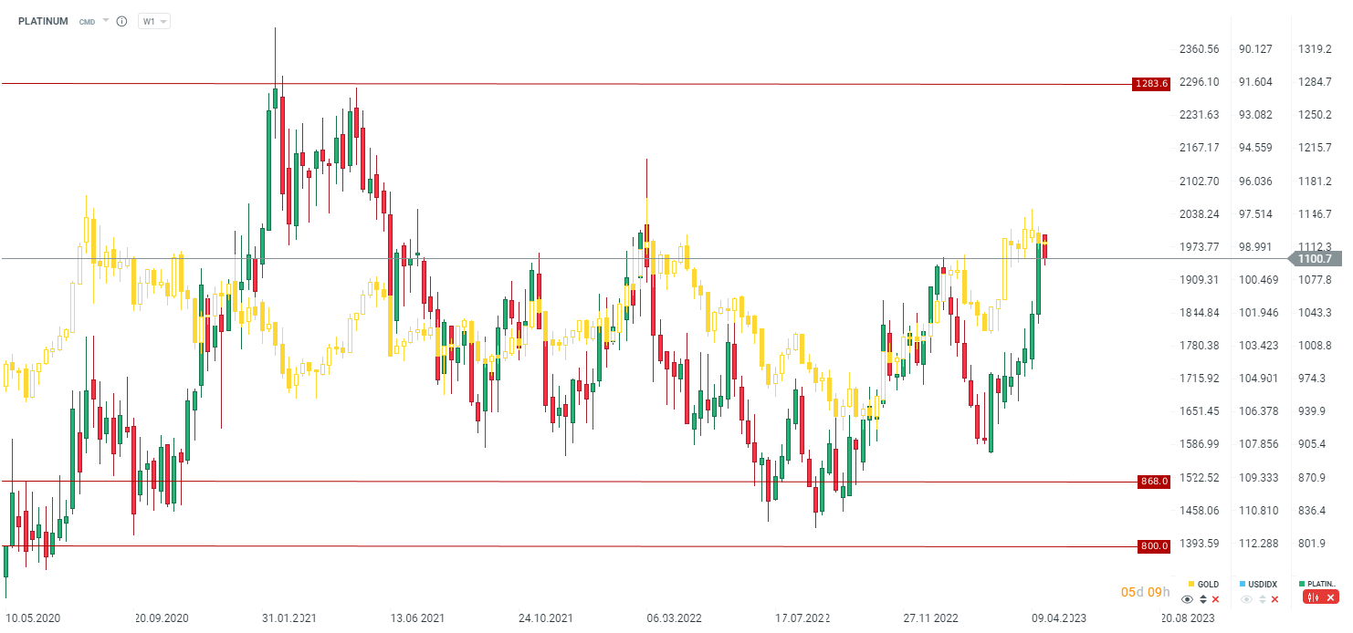Il platino è salito al livello più alto dal febbraio 2022 (in base ai prezzi di chiusura) la scorsa settimana dopo aver superato l'area di $ 1.100 per oncia. Questa zona è attualmente in fase di test come supporto. Da un punto di vista fondamentale, le prospettive per il platino sembrano positive: l'uso del platino nelle nuove tecnologie ecologiche aumenta e potrebbe servire come spinta per la domanda a lungo termine. Le prospettive per il rimbalzo del platino sono state contrastanti per anni poiché le prospettive per il settore automobilistico erano incerte, in particolare per le auto con motori diesel. Tuttavia, la situazione sta cambiando.