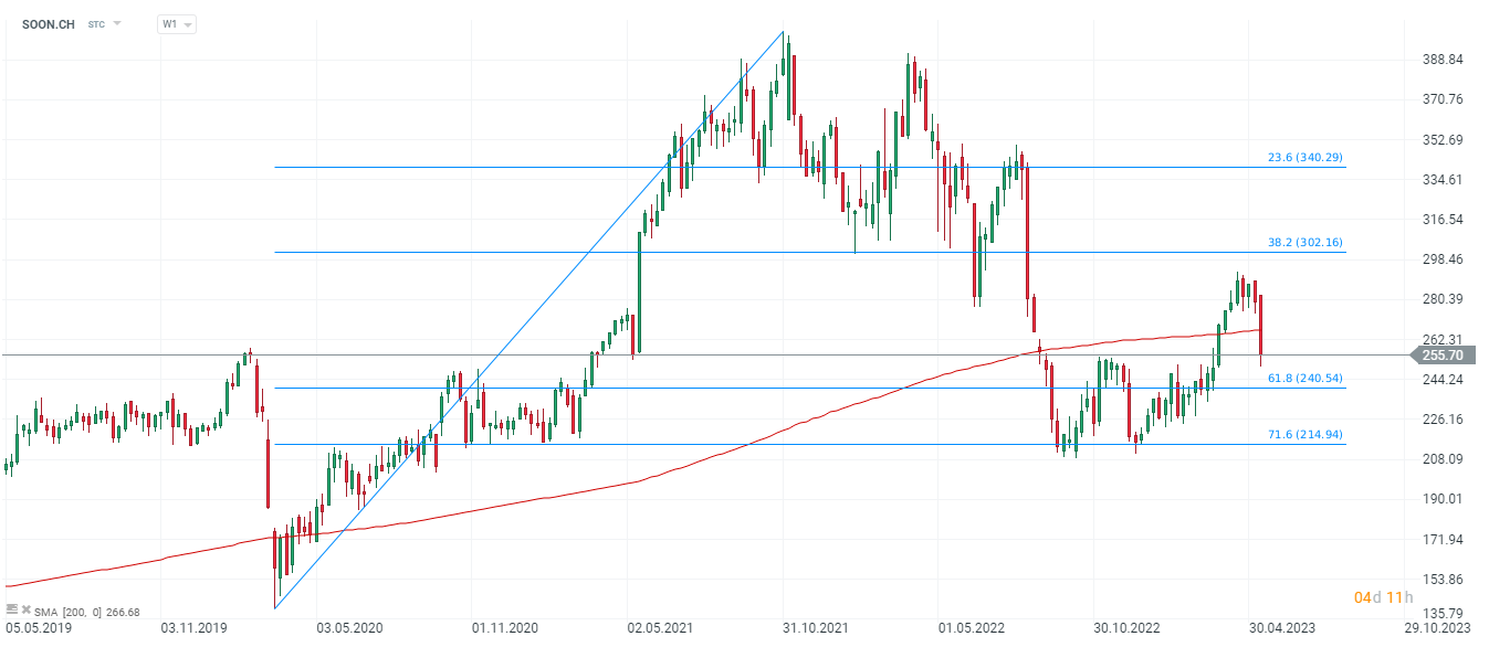 Sonova (SOON.CH) azioni, Grafico W1. Il prezzo delle azioni era ai livelli di gennaio 2020, poco prima del crollo legato al covid che ha colpito la domanda dei suoi servizi e prodotti. Il titolo si è stabilizzato al di sotto della SMA200 (linea rossa) segnalando che è ancora possibile un test del trend intorno al 61,8% e 71,6% del ritracciamento di Fibonacci. Se il supporto stabilito dalla reazione dei prezzi del 2020 non regge, un test di 240 franchi per azione diventerà realistico. Fonte: xStation5.