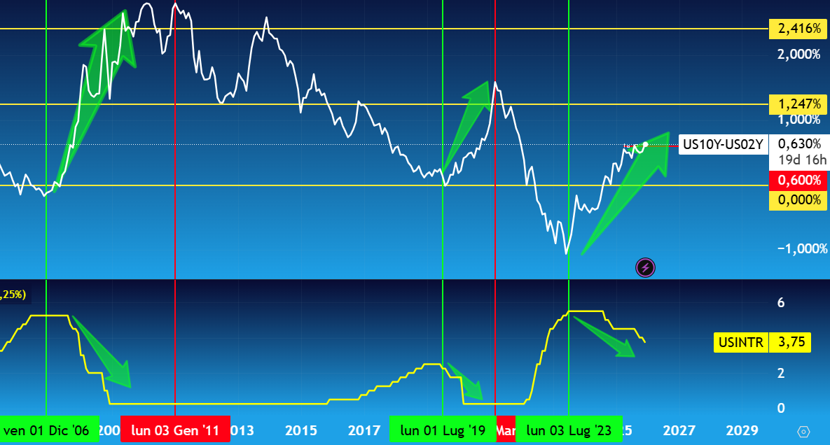 Lo spread tra i titoli di Stato a 2 e 10 anni arriva ai massimi, un indicatore importante nell'identificare quello che potrebbe essere un vero e proprio ciclo di tagli dei tassi e che di fatto inizia a salire nell'immediato taglio dei tassi di mercoledí. Il motivo della sua importanza risiede nella reattivitá dei titoli a 2 anni rispetto ai tassi, ossia quando i tassi vengono tagliati i titoli a breve scadenza iniziano a vedere dei rendimenti in calo piú forte rispetto ai titoli a lunga scadenza, questo per la "vicinanza" temporale di questi titoli ai tassi di interesse. A livello tecnico, secondo uno studio dell'analista di Xtb, lo spread avrebbe due target naturali nel suo movimento, il primo in area 120 punti base e il secondo in area 240 punti base. Il primo target identifica e certifica il ciclo di taglio tassi mentre il secondo target identifica i minimi dei tassi di interesse. Al momento lo spread si trova a 63 punti base, livello toccato per la terza volta quest'anno, la prima ad aprile e la seconda tra fine agosto e inizio settembre. Attenzione quindi a questo spread in quanto il suo rialzo potrebbe anticipare quello che é il futuro della Fed.