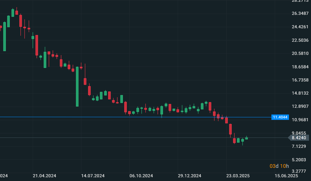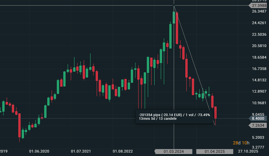 Osservando l'andamento dei prezzi nel lungo periodo, prendendo a riferimento un grafico a timeframe mensile, possiamo osservare una tendenza marcatamente ribassista. Il ribasso nel suo complesso, prendendo come riferimento i massimi storici di marzo 2024, é di oltre il -70%, un calo molto consistente. Solamente negli ultimi tre mesi, prendendo come riferimento i massimi e minimi da febbraio il ribasso é di oltre il -45%. Questi rendimenti cosí negativi potrebbero essere molto appetibili per gli investitori di lungo periodo ma, osservando il settore e l'andamento macroeconomico a livello globale, la prospettive non sono rosee, soprattutto considerando che il gruppo ha di fatto bloccato l'uscita delle guidance per il 2025. La prudenza in questo momento é massima.