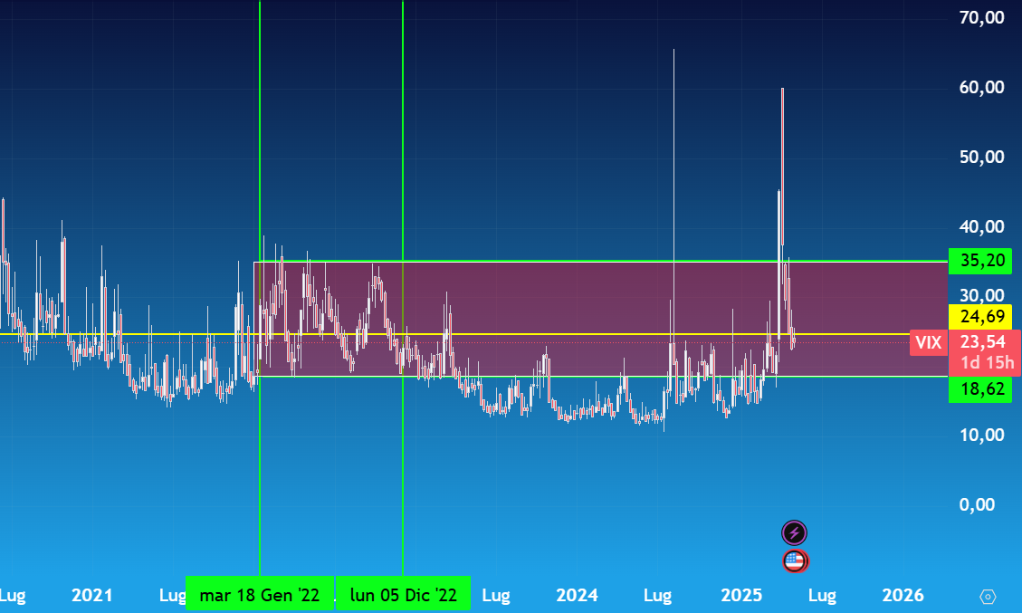 VIX: L'area rossa indica l'area di massimo e minimo del Vix nel bear market del 2022 - Fonte: Tradingview - Studio: David Pascucci