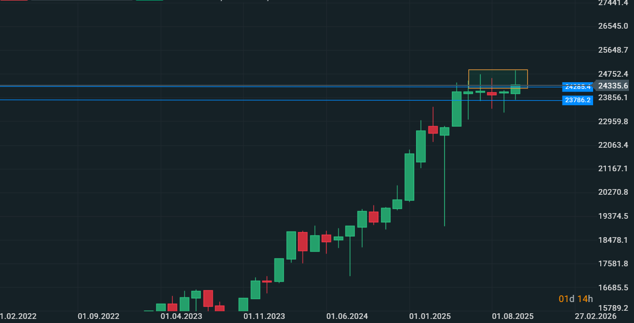 Osservando i mercati americani e giapponesi, vediamo delle quotazioni assolutamente fuori norma, rendimenti incredibili considerando il tempo trascorso dai minimi di aprile. Il problema piú grande al momento é che ci troviamo in un clima di totale incertezza sui dati per via dello shutdown, in concomitanza dell'uscita delle trimestrali e a ridosso delle chiusure tecniche mensili che risultano alquanto discutibili, soprattutto vedendo l'Europa. Ad esempio il Dax sta faticando molto a salire, anzi, sembra voler consolidare la zona massimi come una zona venduta, l'esatto opposto di quanto vediamo in Usa e in Giappone dove gli indici sembrano voler proseguire tranquillamente la loro corsa al rialzo. Ricordiamo che il Buffett Indicator, un indicatore che storicamente si é dimostrato statisticamente valido, si trova sui suoi massimi assoluti a 225%, livelli mai visti neanche nella bolla dotcom, una condizione che di certo non promuove l'investimento nel lungo periodo sul rischio.