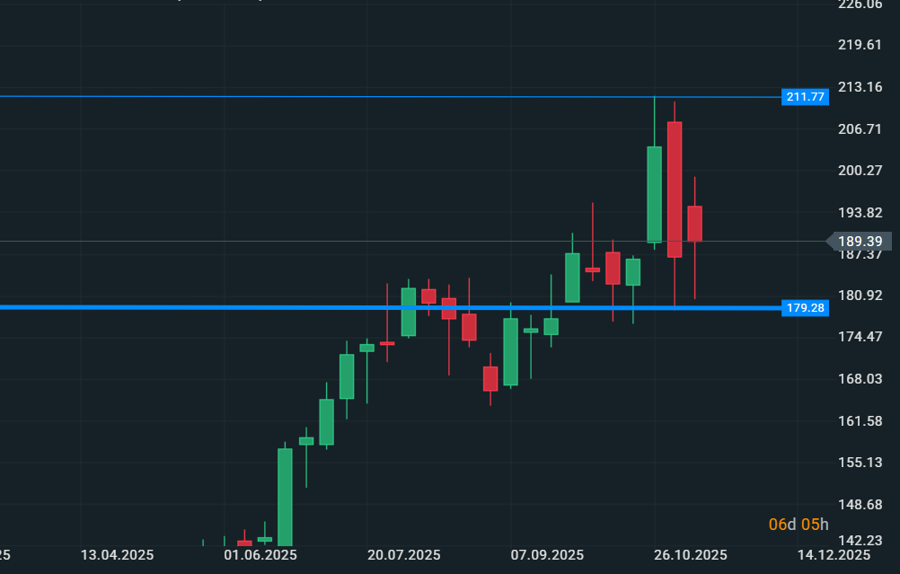 Un titolo che sta letteramente guidando i mercati Usa con la sua maxi-capitalizzazione e che di fatto trascina anche tutti gli altri titoli del settore dell'Ia verso capitalizzazioni estreme rispetto al resto del mercato. Le aspettative sul titolo sono rosee, non di certo ci si aspetta una trimestrale negativa, tutto dipenderá dai prezzi e da come il mercato sará strutturato a livello tecnico nel corso dei prossimi giorni fino alla serata di mercoledí. Per il momento il titolo in questo mese ha perso circa un -16% dai massimi assoluti e al momento gravita intorno al -10% sulla chiusura settimanale di venerdí, una condizione tecnica ancora in fase di costruzione e che richiede un attento monitoraggio fino alla serata di mercoledi, mentre giovedí sará il giorno della sentenza dei mercati quando in concomitanza con la reazione del cash alla trimestrale ci saranno anche i dati sull'occupazione in Usa. I livelli da attenzionare sono quelli relativi ai massimi e ai minimi delle scorse settimane, quindi area 210 per i massimi e area 180 per i minimi.