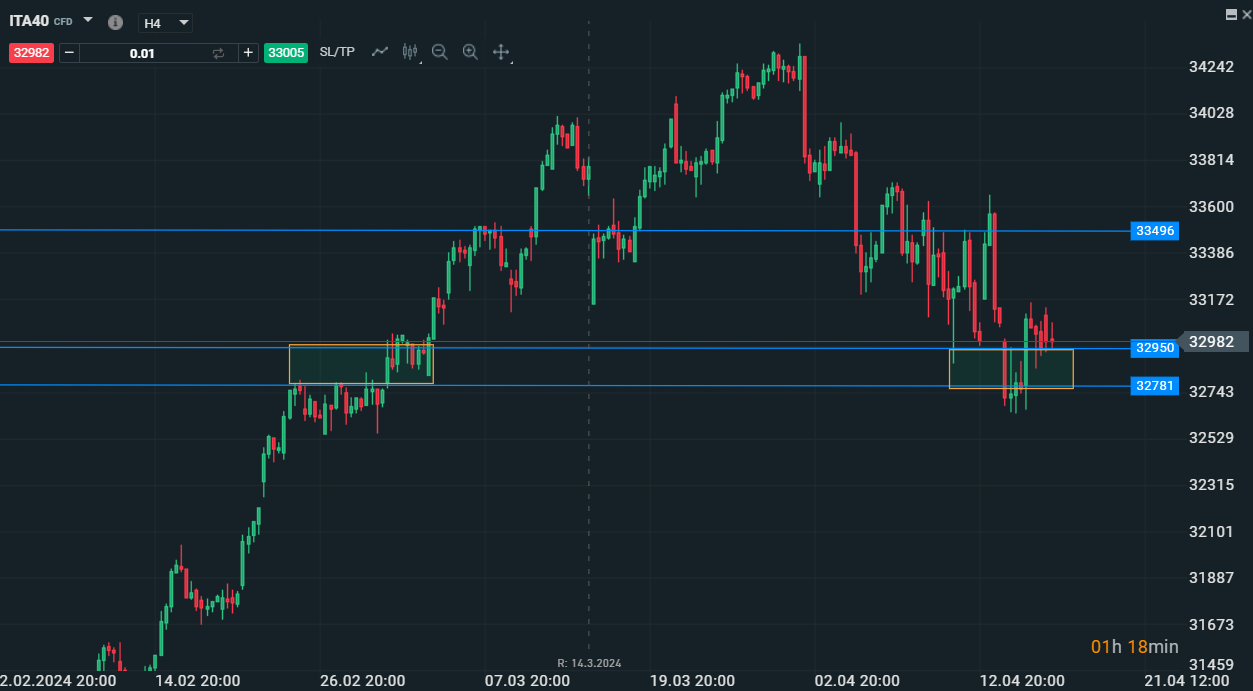 Aree di supporto-resistenza su Ftse Mib su base 4h - Fonte:XStation