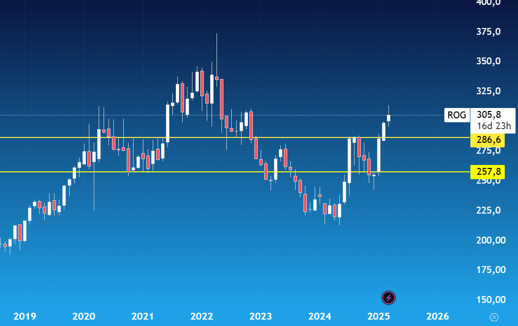 Il titolo in questione presenta una dinamica dei prezzi rialzista per il lungo periodo, staccandosi momentaneamente dal resto del mercato con una performance di circa il 30% dalla fine del 2024. La situazione tecnica non sembra assolutamente compromessa e il trend rimane stabilmente positivo. Ricordiamo che un trend positivo, dopo una performance del genere, potrebbe giungere ad interruzioni, anche per via della situazione attuale di mercato. L'attuale prezzo dei 305,8 Chf é distante dal primo eventuale supporto che si trova in area 286, pertanto non si esclude un ritorno verso quei livelli qualora si dovesse innescare una dinamica di ritracciamento. Altro livello importante é quello dei 257 che rappresenta il supporto piú importante di lungo periodo.