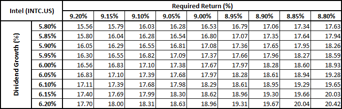 Il terzo metodo di valutazione che utilizzeremo è il Gordon Growth Model, un metodo basato sui dividendi. Intel ha una lunga esperienza nel pagamento e nell’aumento dei dividendi, ma un punto chiave da notare è che all’inizio di quest’anno è stato effettuato un notevole taglio dei dividendi. Il pagamento trimestrale è stato ridotto da 0,365 dollari per azione a 0,125 dollari per azione. Si tratta di una riduzione del 65%! Il dividendo cumulativo per gli ultimi 4 trimestri è di $ 0,98 per azione. Inserendo questo valore nel modello di crescita di Gordon, nonché il costo storico del capitale proprio di circa il 9% e la crescita storica dei dividendi del 6% come ipotesi, ci porta a una valutazione di $ 34,63 per azione, quasi esattamente in linea con l'attuale prezzo di mercato.